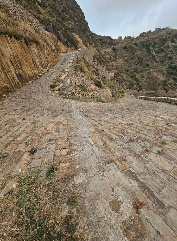 أظهرت إحدى الصور الملتقطة من الأعلى الانحدار الشديد للمدرجات المزروعة بأشجار البن ومحاصيل أخرى، إلى جانب الطريق الرئيسي، كما تبرز المنازل المعلقة فوق المدرجات والطرق المتعرجة والجدران الحجرية المتناغمة مع المنحدرات، في مشهد يجمع بين الطبيعة والبناء البشري بتناغم فريد. ولفت الناشط السياحي فهد إسماعيل الأنباري إلى أن الانحدار الفعلي للطريق أقل مما تبدو عليه الصورة، موضحاً تأثير زاوية الالتقاط على الانطباع البصري، وأرفق صوراً أخرى لتوضيح ذلك.
