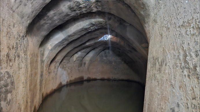 وعند الدخول إلى البركة المسقوفة ينذهل الناظر إلى الأعلى من جمال العقود المنتظمة، المبنية على ارتفاع يتجاوز سبعة أمتار من قاع البركة.