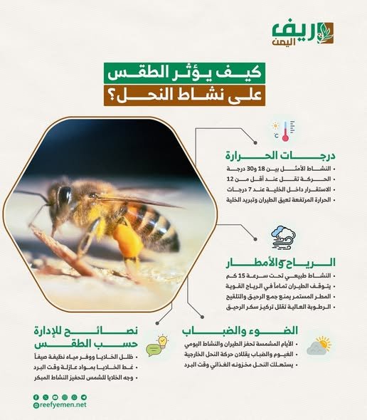يعرض هذا التقرير الإرشادي من منصة ريف اليمن أهم العوامل الجوية المؤثرة على نشاط النحل، مع نصائح عملية لإدارة الخلايا وفقًا لهذه الظروف لضمان إنتاجية مستمرة، وحماية الطوائف.