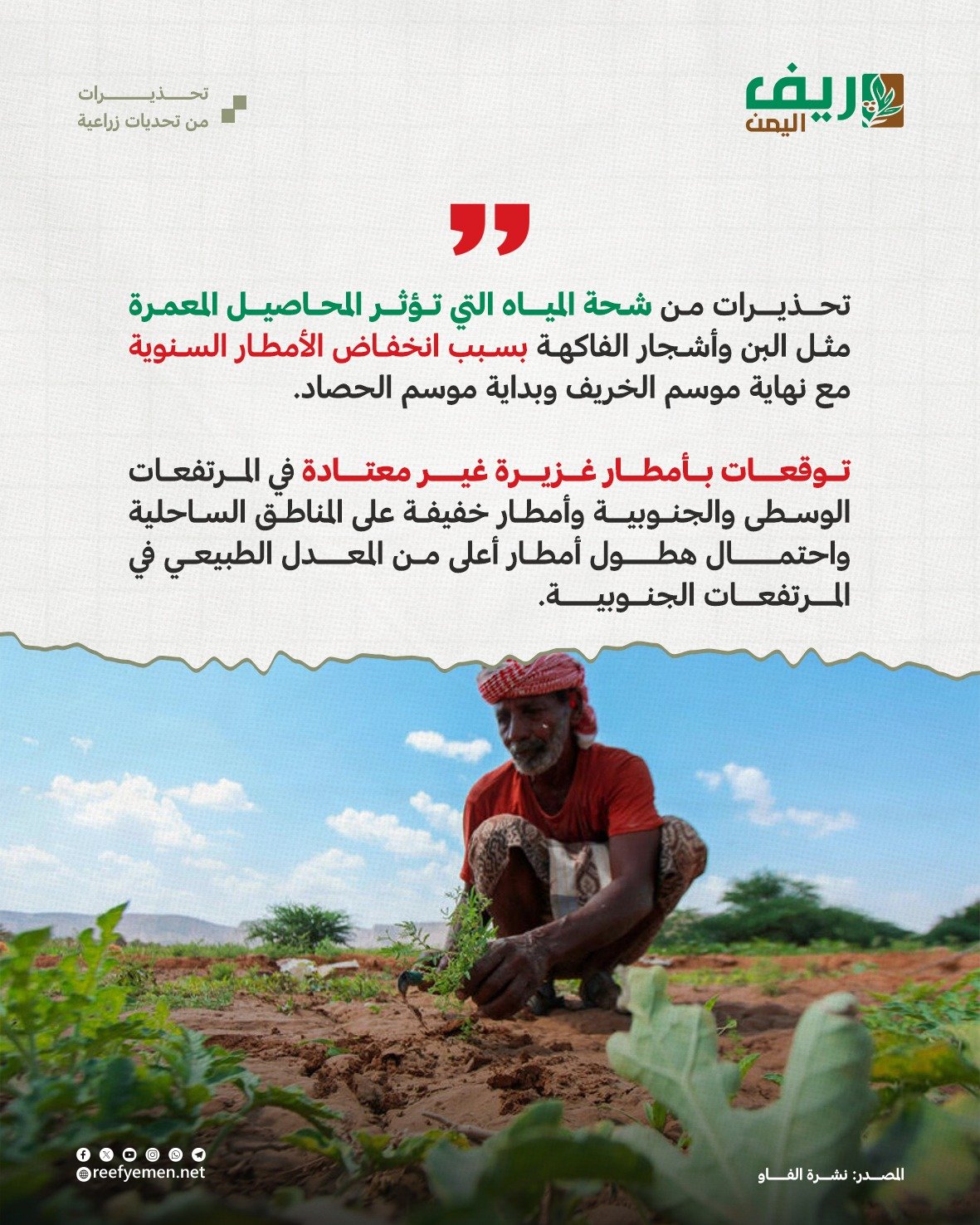 حذرت منظمة الأغذية والزراعة التابعة للأمم المتحدة (الفاو) من تحديات زراعية متزايدة في اليمن مع نهاية موسم الخريف، وسط شحة في المياه وانخفاض في كميات الأمطار السنوية، ما يهدد المحاصيل المعمرة مثل البن وأشجار الفاكهة مع اقتراب موسم الحصاد.