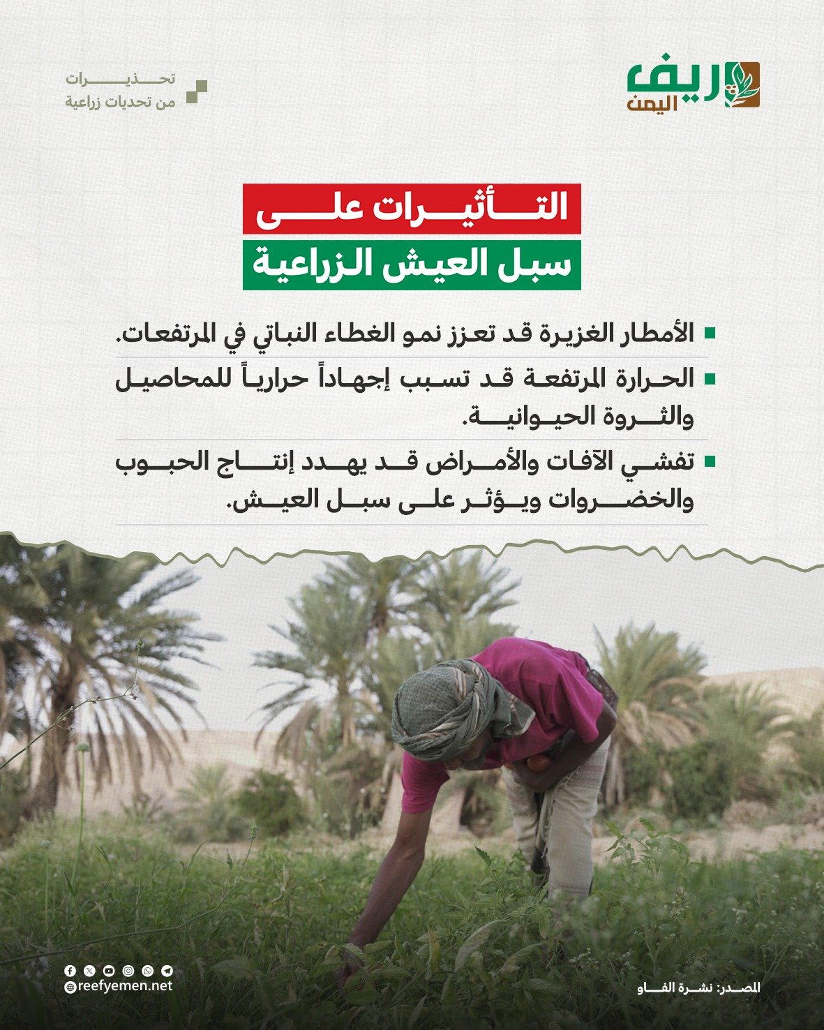 وأضافت النشرة أن هذه التغيرات المناخية قد تحمل آثاراً متباينة على سبل العيش الزراعية، إذ من المتوقع أن تعزز الأمطار الغزيرة نمو الغطاء النباتي في المرتفعات، في حين قد تسبب درجات الحرارة المرتفعة إجهاداً حرارياً للمحاصيل والثروة الحيوانية، كما يُتوقع أن يؤدي تفشي الآفات والأمراض إلى تهديد إنتاج الحبوب والخضروات.