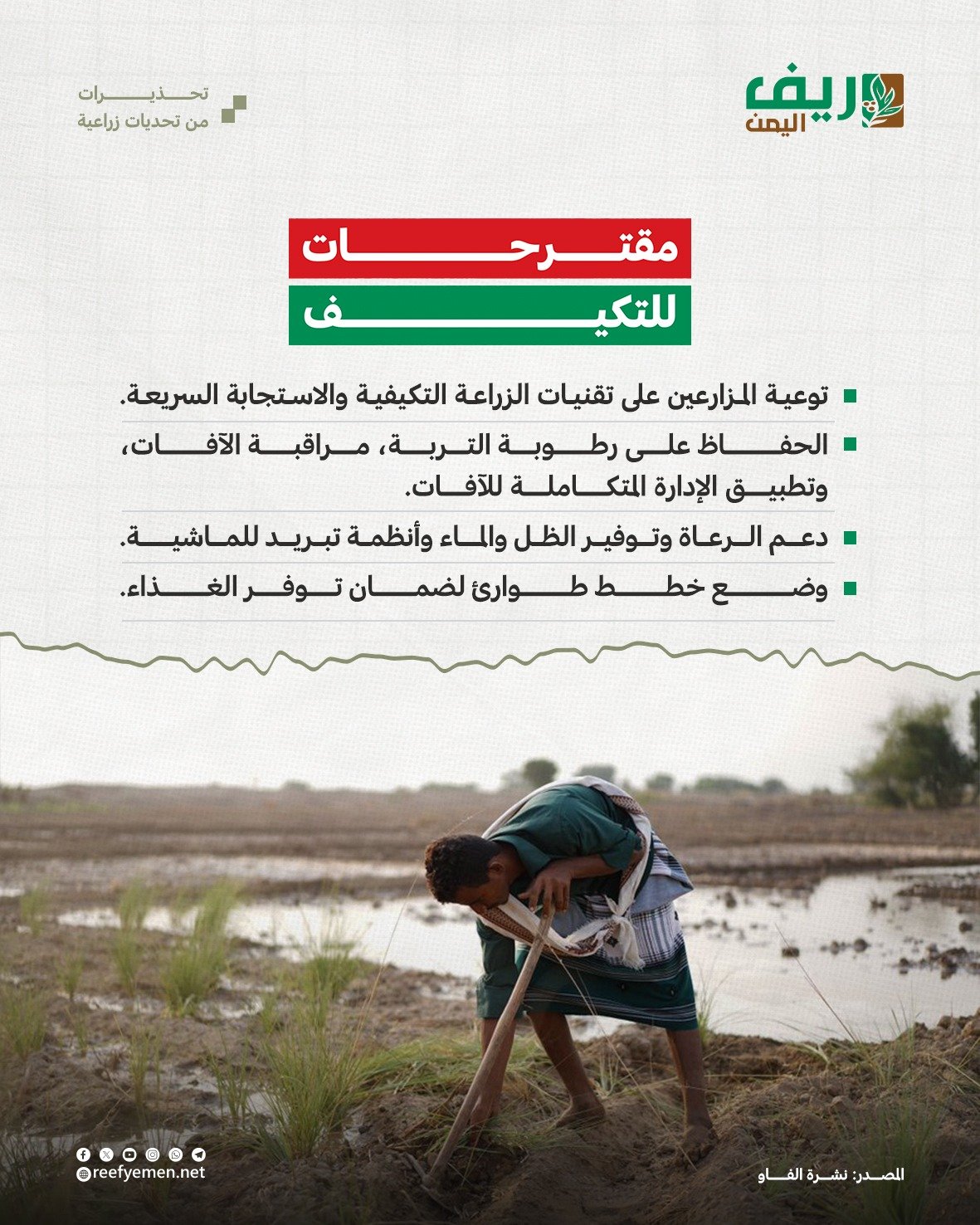 وأوصت المنظمة بتوعية المزارعين على تقنيات الزراعة التكيفية والاستجابة السريعة، والحفاظ على رطوبة التربة، ومراقبة الآفات عبر تطبيق الإدارة المتكاملة، كما دعت إلى دعم الرعاة من خلال توفير الظل والماء وأنظمة التبريد للماشية، إضافة إلى وضع خطط طوارئ لضمان توفر الغذاء.