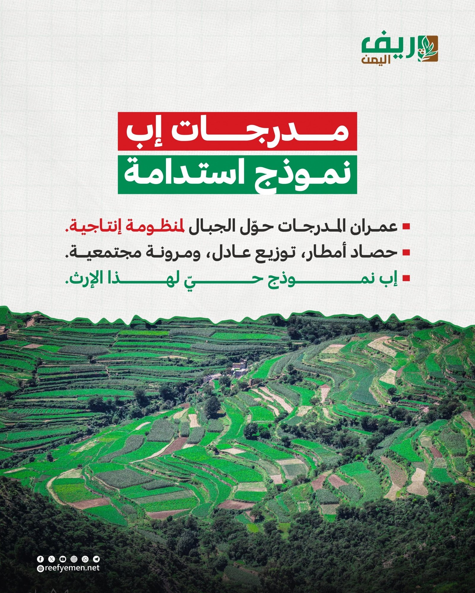 حولت مدرجات محافظة إب الجبال إلى منظومة إنتاجية مستدامة، تجمع بين حصاد الأمطار، التوزيع العادل للمياه، والمرونة المجتمعية، لتصبح المحافظة نموذجاً حياً لهذا الإرث الزراعي التقليدي.
