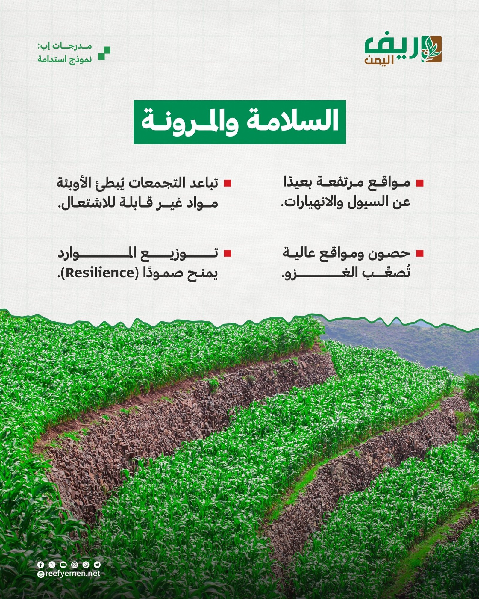 وفي هذه المدرجات أيضاً تتوزع القرى والمزارع في مواقع مرتفعة بعيداً عن السيول والانهيارات، مع تباعد التجمعات للحد من انتشار الأوبئة، وتوسع الحرائق المشتعلة، كما توفر الحصون والمواقع المرتفعة صعوبة أمام الغزاة، بينما يسهم توزيع الموارد في تعزيز الصمود المجتمعي.