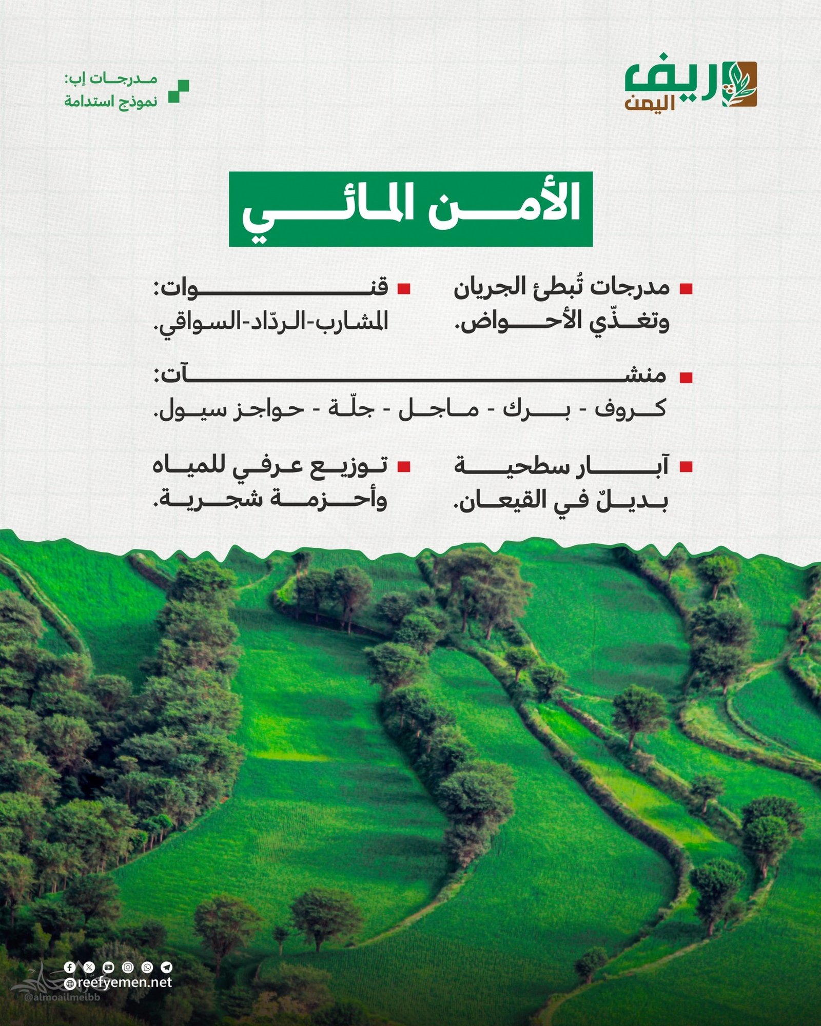 وتعمل المدرجات على إبطاء جريان المياه وتغذية الأحواض، مدعومة بقنوات تقليدية مثل المشارب والرداد والسواقي، ومنشآت تضم كروف وبرك وماجل وأجلة وحواجز سيول، إضافة إلى آبار سطحية في القيعان، ويعتمد السكان على نظم توزيع عرفية للمياه، مصحوبة بأحزمة شجرية تحافظ على التربة.