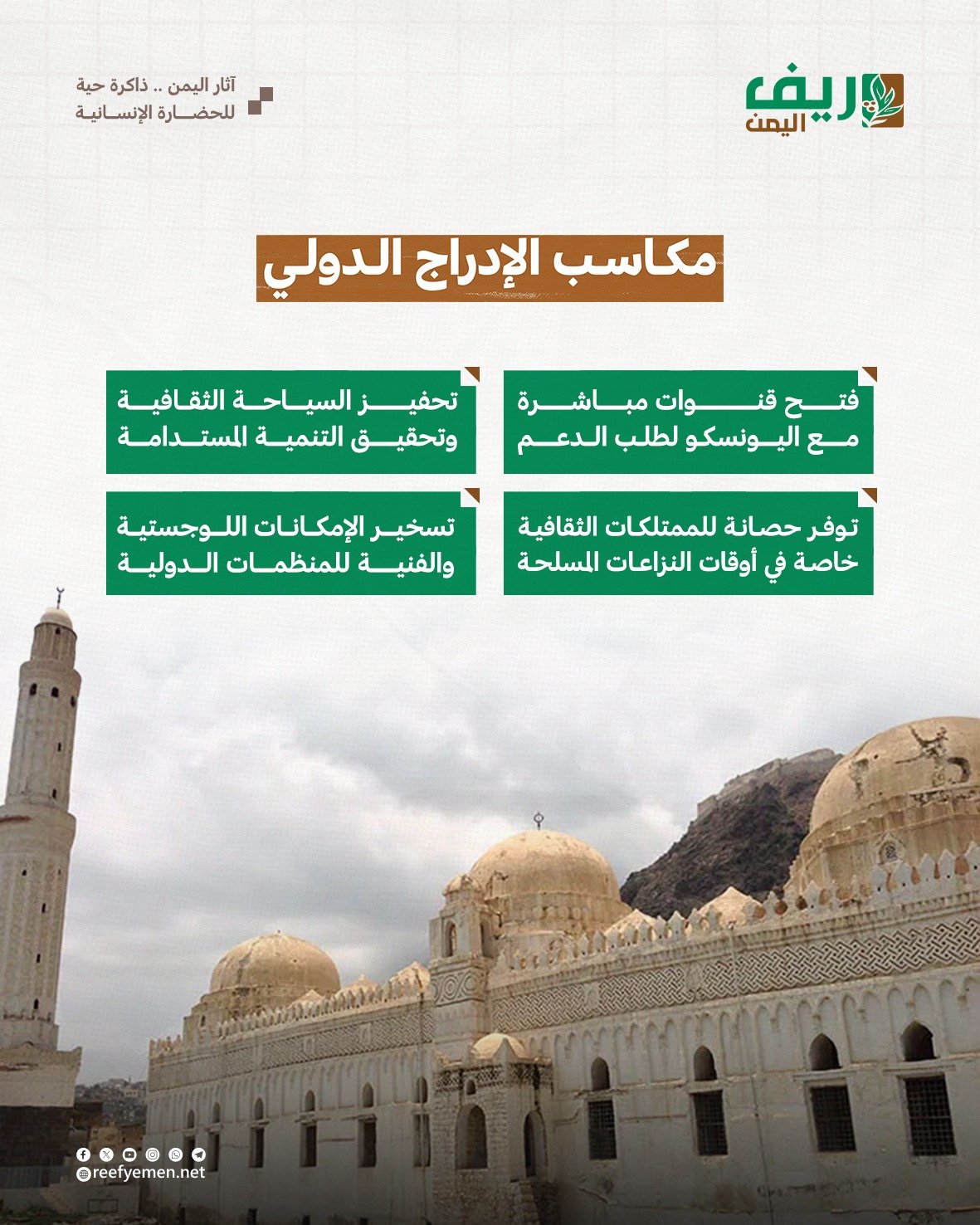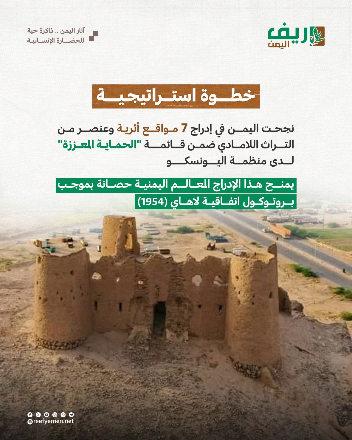 وقد نجحت الجهات المعنية في اليمن مؤخراً في إدراج سبعة مواقع أثرية وعنصر من التراث اللامادي ضمن قائمة “الحماية المعززة” لدى منظمة الأمم المتحدة للتربية والعلم والثقافة “اليونسكو”، ما يمنح هذه المعالم حصانة قانونية بموجب بروتوكول اتفاقية لاهاي لعام 1954 الخاص بحماية الممتلكات الثقافية أثناء النزاعات المسلحة.