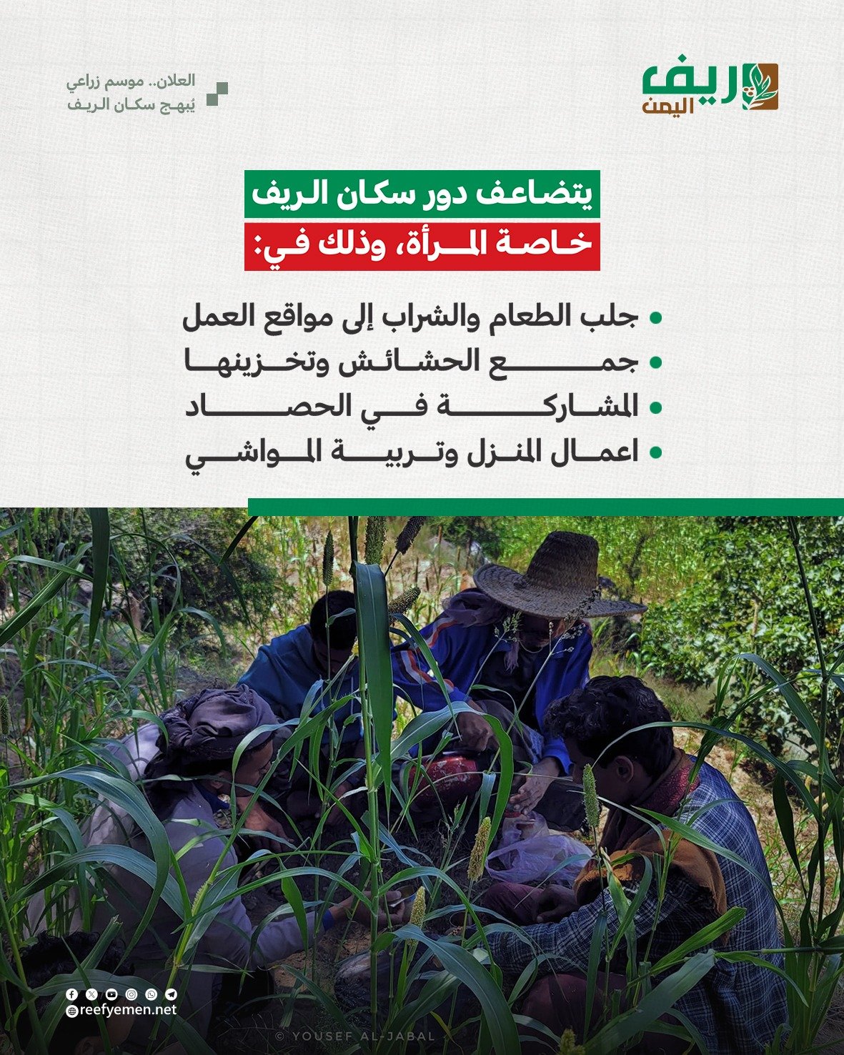 ويتضاعف خلال هذا الموسم نشاط سكان الريف، وتبرز المرأة الريفية بدور محوري في مختلف المهام، من جلب الطعام والشراب إلى مواقع العمل، إلى جمع الحشائش وتخزينها، والمشاركة في أعمال الحصاد وتربية المواشي إلى جانب مهامها المنزلية اليومية.
