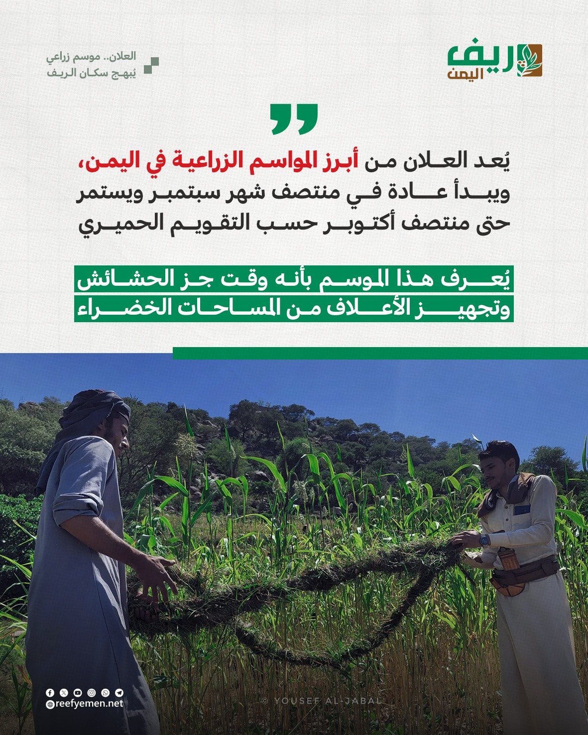 يُعدّ موسم العلان من أبرز المواسم الزراعية في اليمن، إذ يبدأ عادة في منتصف سبتمبر ويستمر حتى منتصف أكتوبر وفق التقويم الحميري القديم، ويُعرف هذا الموسم بأنه فترة جزّ الحشائش وتجهيز الأعلاف من المساحات الخضراء استعداداً لفصل الجفاف.