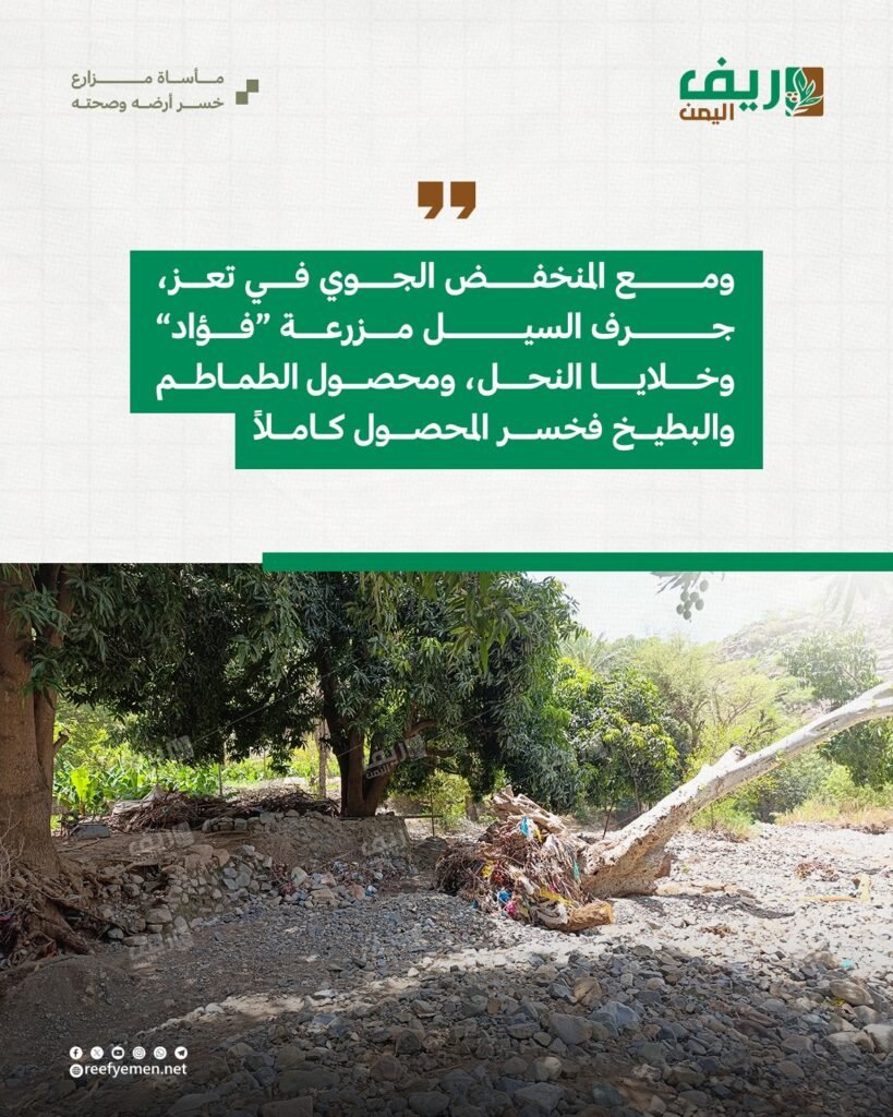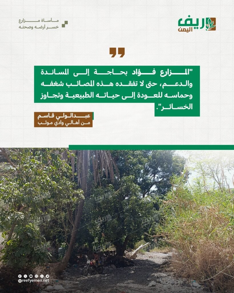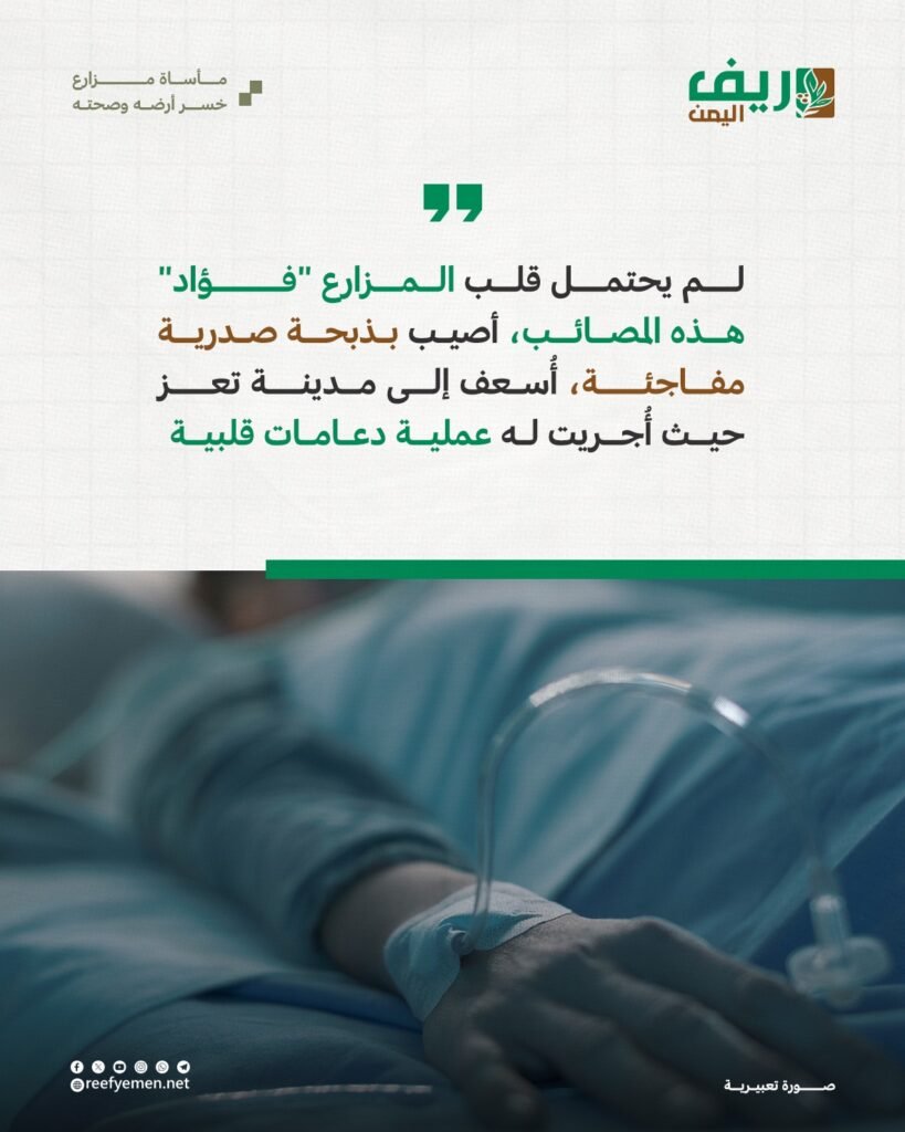 أُصيب المزارع الخمسيني ‹فؤاد العكشي› بذبحة صدرية مفاجئة بعد أيام من خسارته كل المصادر التي كانت توفر المعيشة لأسرته في ‹وادي موثب› بمديرية مقبنة غربي تعز.