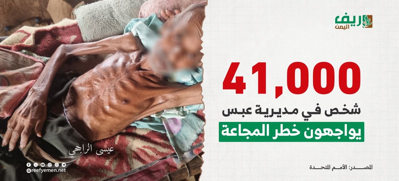 يشهد الوضع الإنساني في مديرية عبس بمحافظة حجة (شمال غربي اليمن) تدهوراً حاداً، حيث يواجه أكثر من 41 ألف شخص خطر المجاعة، فيما تُعاني ربع النساء من سوء تغذية حاد.