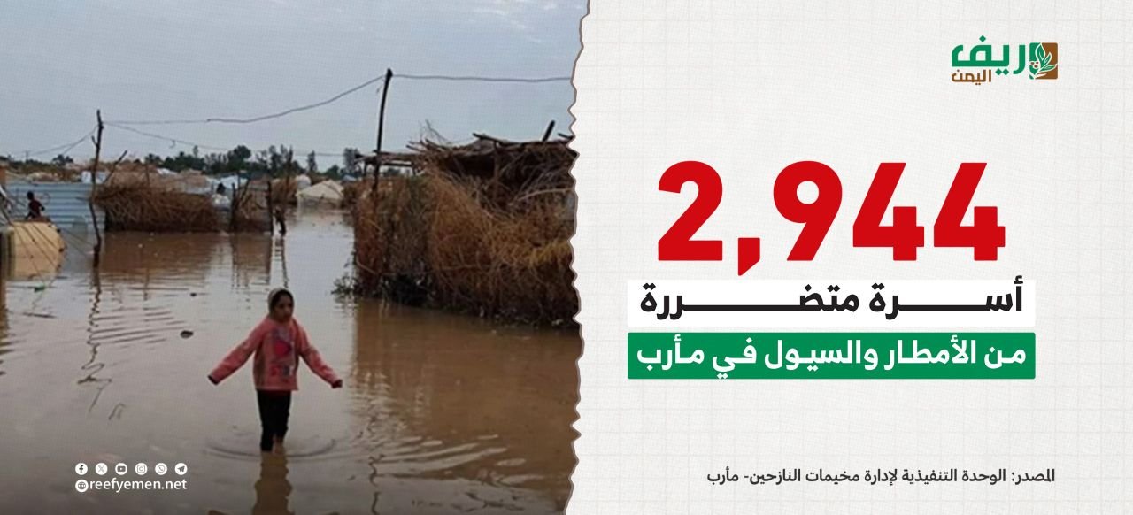 أفادت الوحدة التنفيذية لإدارة مخيمات النازحين في مأرب بأن الأمطار والسيول الأخيرة تسببت في أضرار لنحو 2,944 أسرة.