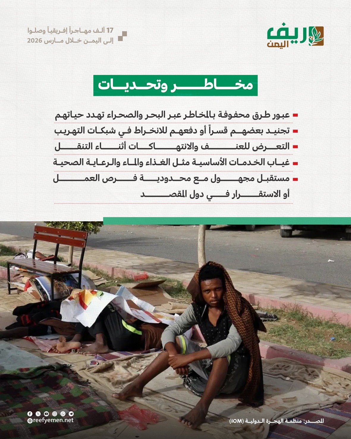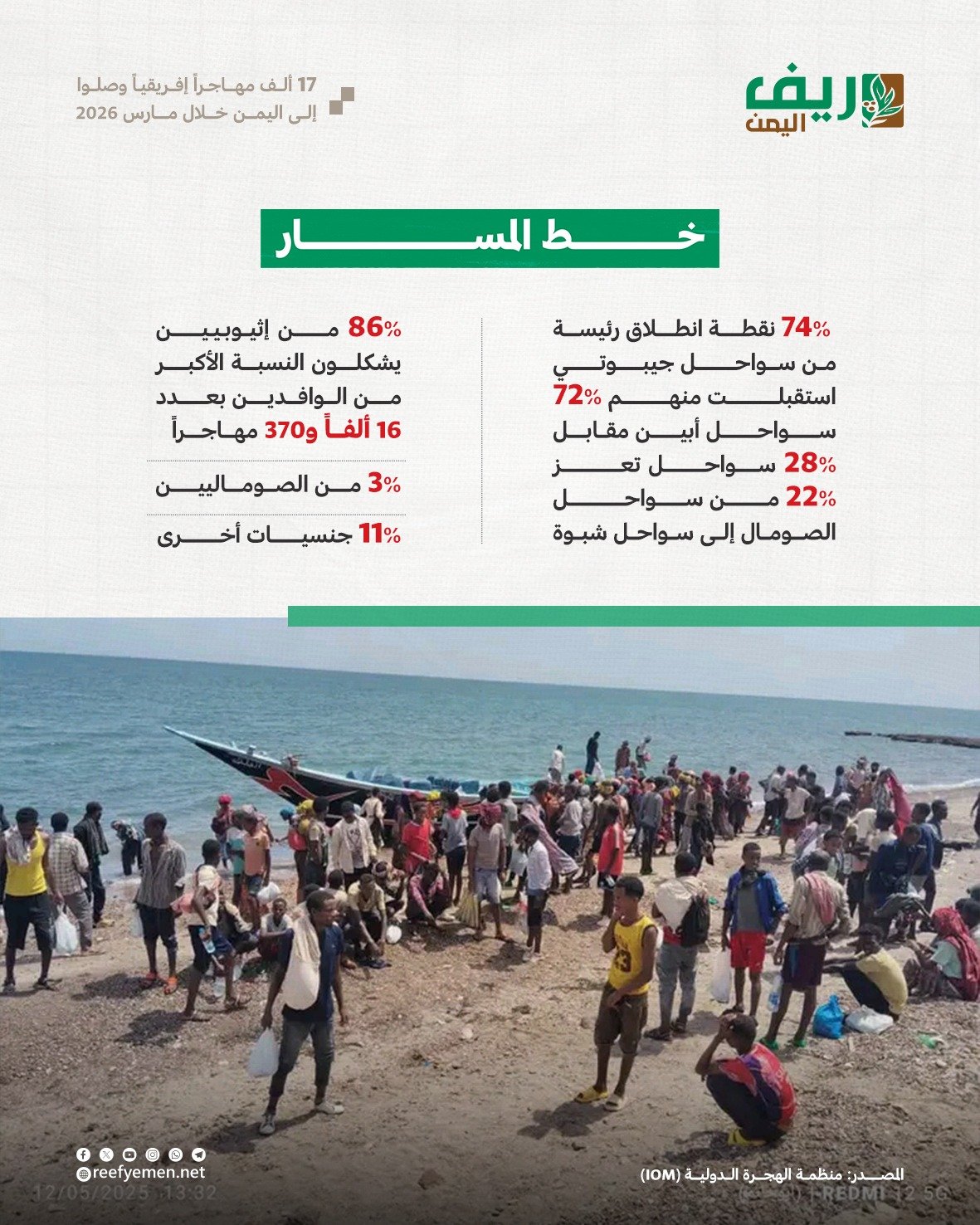 اليمن.. وصول 17 ألف مهاجر أفريقي خلال شهر ✍️ أمة الغفور السريحي 📅 15 أبريل 2026 💬 0 تعليق تشهد اليمن تزايداً ملحوظاً في حركة الهجرة من القرن الإفريقي، حيث أعلنت منظمة الهجرة الدولية أن أكثر من 17 ألف مهاجر إفريقي وصلوا إلى البلاد خلال شهر مارس الماضي، في مؤشر على اتساع موجات الهجرة نحو السواحل اليمنية. 📌 الوسوم: المهاجرين الأفارقة , الهجرة واللاجئين شارك المقال: فيسبوك | تويتر | تليجرام قد يعجبك أيضاً: المواد ذات الصلةأكثر من مؤلف