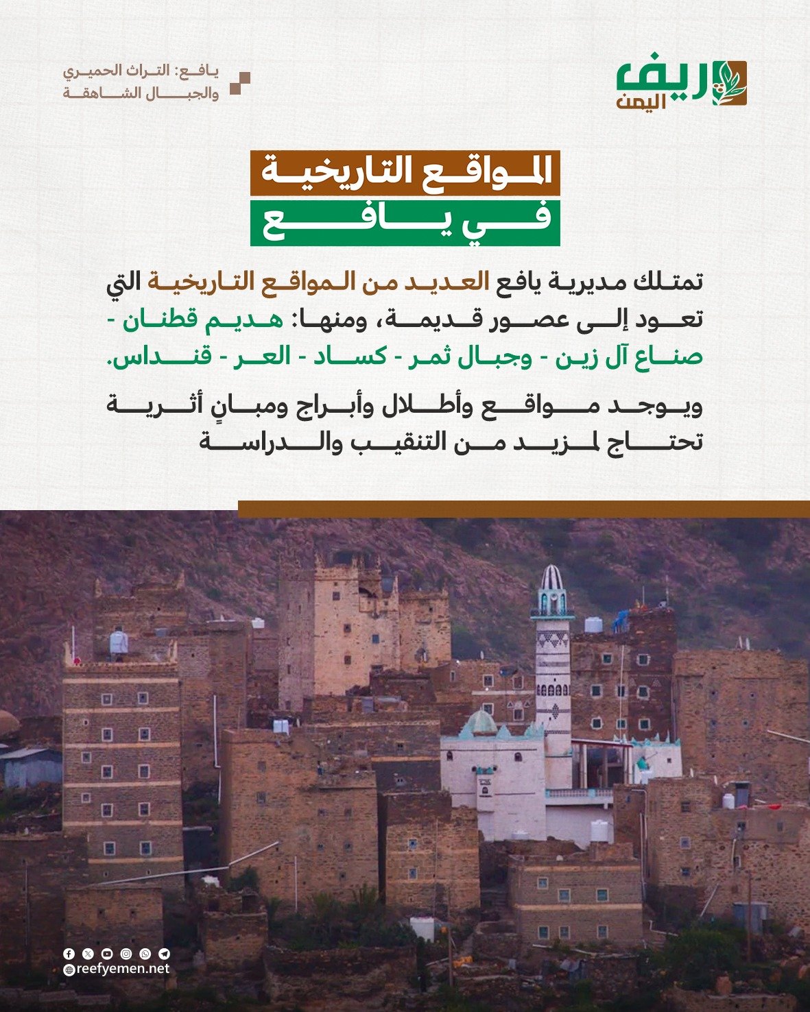 وتحتوي هذه المواقع على أبراج وأطلال أثرية تعكس تاريخ يافع الغني والمتنوع، ولا تزال بحاجة إلى المزيد من أعمال التنقيب والدراسات الأثرية للكشف عن تاريخها الكامل وتوثيقه.