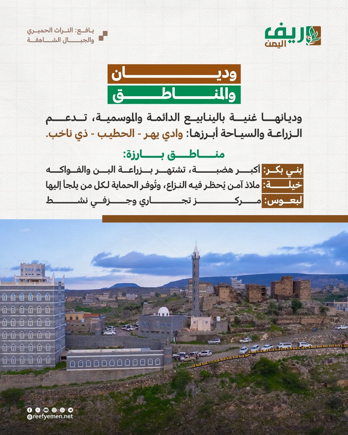 ومن أبرز هذه الوديان وادي يهر، ووادي الحطيب، ووادي ذي ناخب، التي شكّلت عبر التاريخ شرايين حياة للسكان المحليين.