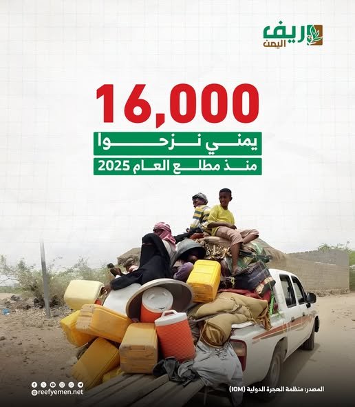 قالت المنظمة الدولية للهجرة التابعة للأمم المتحدة، إن نحو 16 ألف يمني نزحوا من منازلهم منذ مطلع عام 2025، بسبب استمرار الصراع وتدهور الأوضاع الإنسانية في البلاد.
