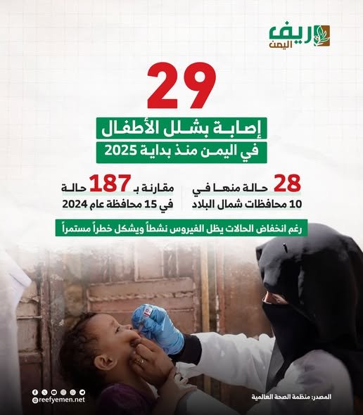 قالت منظمة الصحة العالمية إنه تم تسجيل 29 حالة إصابة مؤكدة بفيروس شلل الأطفال في اليمن منذ مطلع العام الجاري.