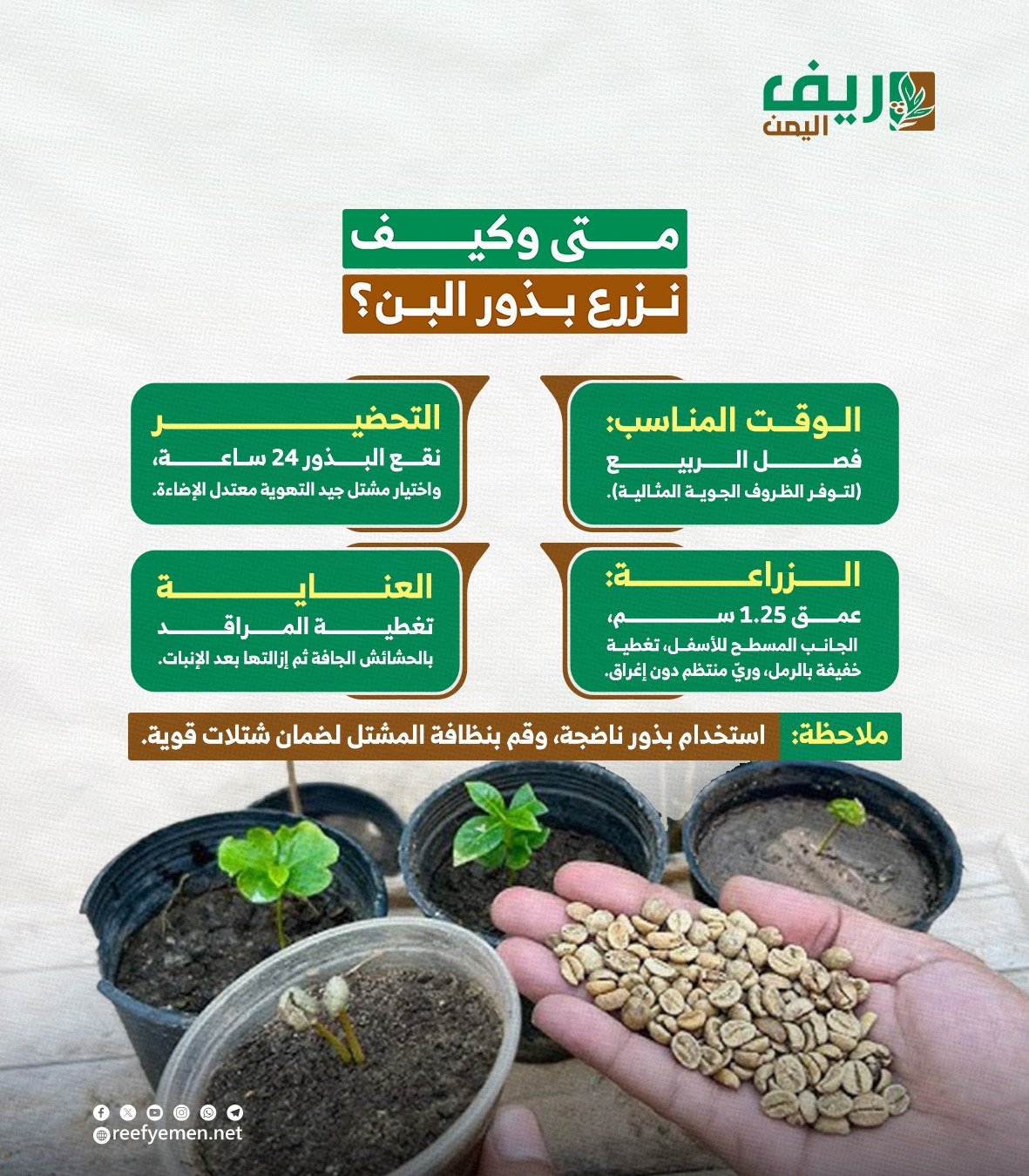 من التقرير الإرشادي في الأعلى وجدنا أن فصل الربيع يُعد الوقت الأمثل لزراعة بذور البن، لما يوفره من ظروف مناسبة للإنبات.